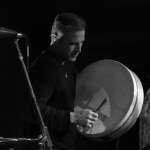 - Sean banging on the drum kit with the bodhrain stick