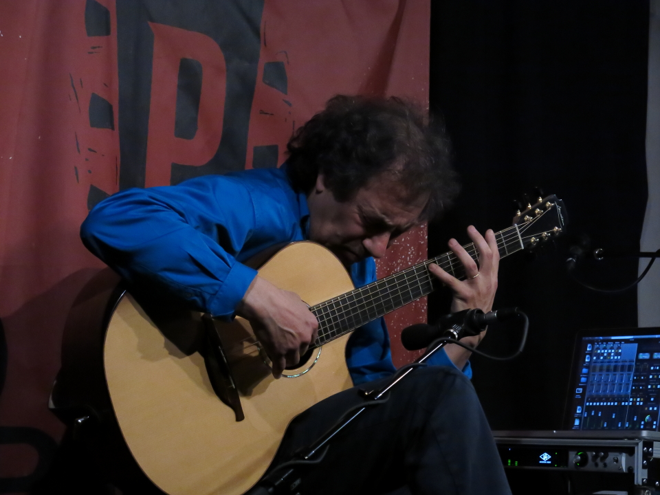 He explained that Pierre uses an unusual tuning on his guitar and that, because he has long fingers, he can span many frets and play combinations of notes that many guitarists cannot (see photo above).