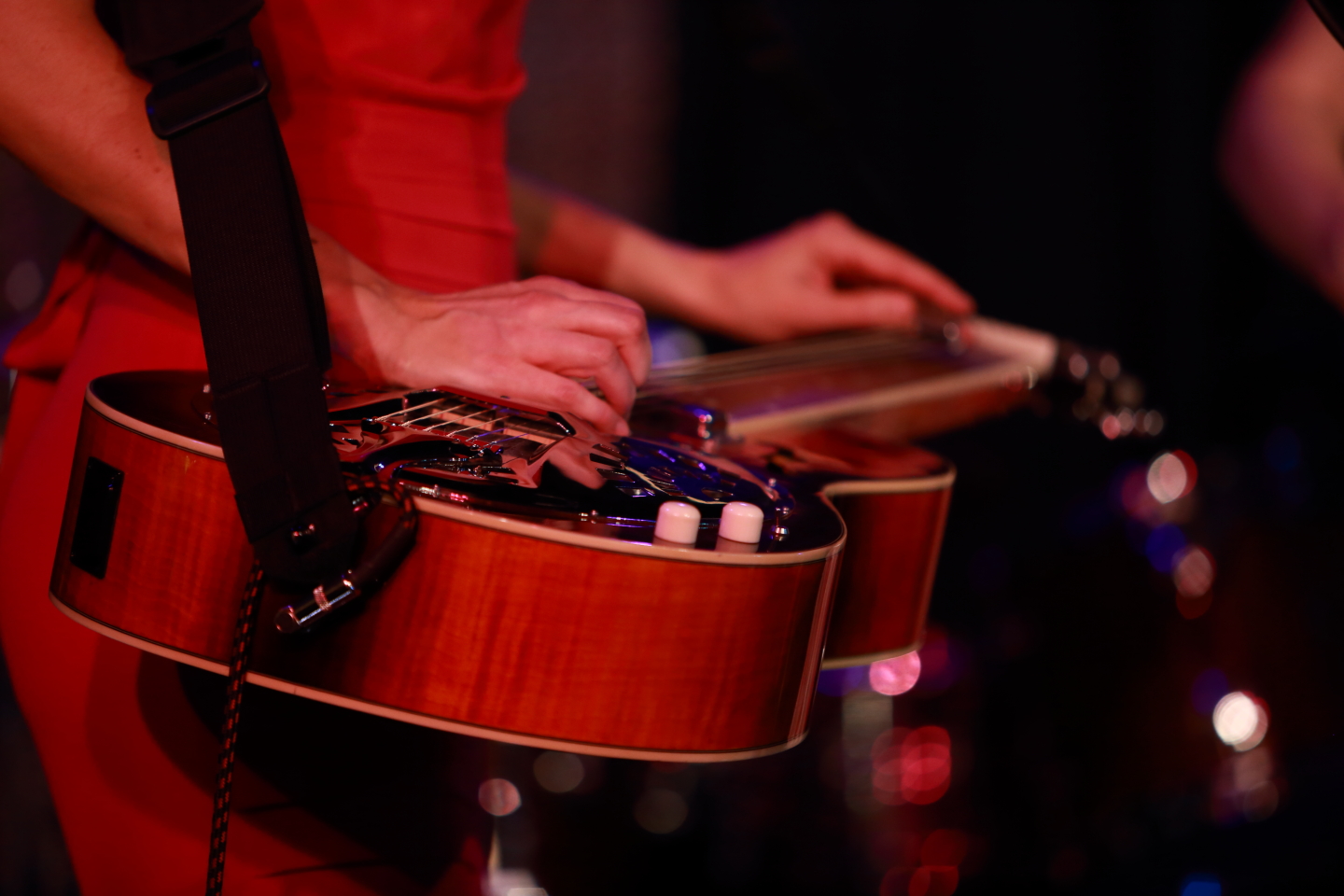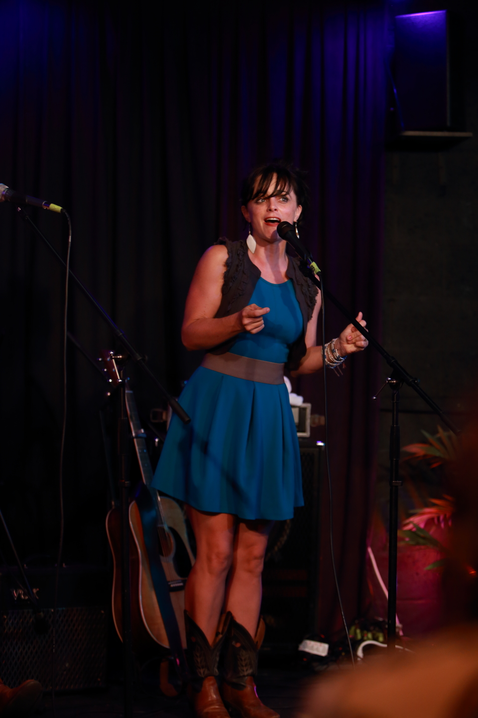 Although Red Molly has been around for ten years, this configuration began four years ago. Their chemistry is so strong that it feels as if they’ve been together much longer than that. One person asked if they realized their dresses were coordinated (Laurie’s floral-print dress had the same colors as Abbie’s and Molly’s solid-color dresses); they told us that it was a coincidence, but I think it shows how attuned to one another they are.