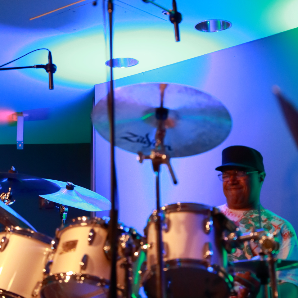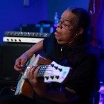 Mike’s style is probably best described as jazz fusion, but he is such a fine musician that he can incorporate any other genre into his tunes as he did this night with the funk rhythms of Dennis Chambers on drums. Unfortunately I could not see Dennis’ face but I could feel his passion and talent. Holding my camera at my knees and not being able to see exactly what was in my viewfinder, I got a few passable images of Dennis, but I do not think they capture the intensity of his playing.