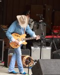 His band is superb (so far, I have not been able to discover their names). One of them, almost hidden in the recesses of the stage, played more instruments than I could count – pedal steel, fiddle, harmonica, and more! All were dressed in black and white, contrasting nicely with Yoakam’s light blue.