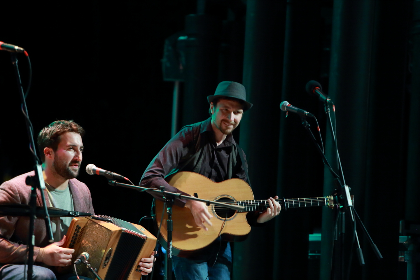 A trio composed of Shane Hayes on accordion, Fiachra Hayes on fiddle, and Aodán Coyne on guitar, with all providing vocals, they play traditional tunes which they have updated. The Hayes brothers teased each other in a good-natured manner, while Coyne stood back and smiled.